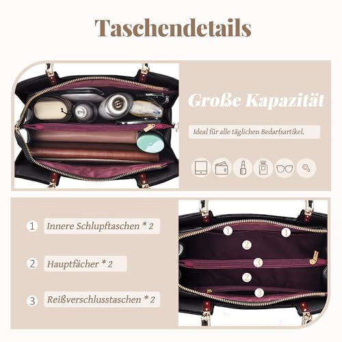 Perfekte Größe: 29 x 11 x 22 cm (L x B x H). Grifflänge: 13 cm. Gewicht: 0,65 kg. 6 Taschen (2 große Haupttaschen, 2 Innentaschen mit Reißverschluss, 2 Handyfächer) bieten Platz für Handy, Geldbörse, Reisepass, Lippenstift, Parfüm, Taschentücher und andere wichtige Dinge und sorgen dafür, dass alles ordentlich und organisiert bleibt.