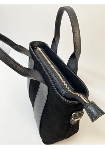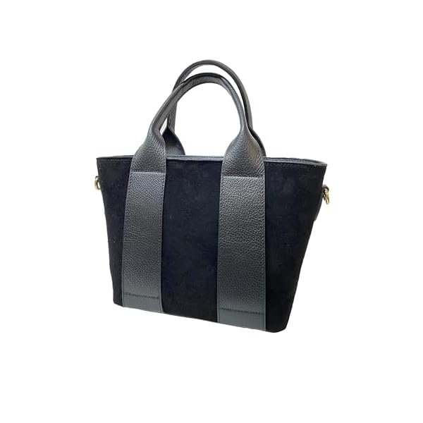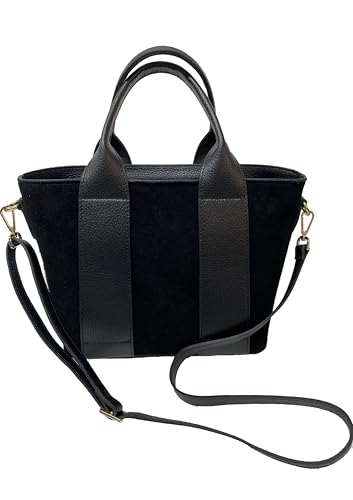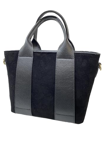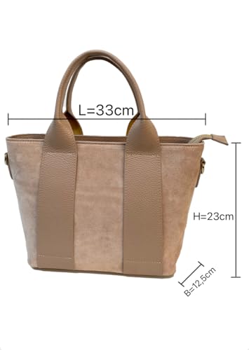 Diese raffinierte Damenhandtasche ist eine perfekte Kombination aus italienischer Eleganz und Alltagstauglichkeit. Hergestellt aus hochwertigem Echtleder und Wildleder zeichnet sich die Tasche durch ihr zeitgemäßes Design aus, das durch elegante Ledereinsätze gekennzeichnet ist, die einen raffinierten Kontrast zum Wildleder bilden. Die geräumige Struktur ist mit mehreren gefütterten Innentaschen organisiert, ideal für die Aufbewahrung Ihrer persönlichen Gegenstände. Die goldfarbenen Metallverzierungen einschließlich des Reißverschlusses verleihen dem Design einen Hauch von Luxus. Robuste Griffe sorgen für einen komfortablen und sicheren Halt. Die Innenfächer sind so konzipiert, dass alle wichtigen Accessoires einer modernen Frau untergebracht werden können, von der Brieftasche bis zum Smartphone. Die großzügige Größe macht sie sowohl für den täglichen Gebrauch als auch für besondere Anlässe perfekt. Ein vielseitiges Accessoire, das die authentische Tradition der italienischen Lederwaren verkörpert, ideal um jedes Outfit mit Stil und Eleganz zu ergänzen.