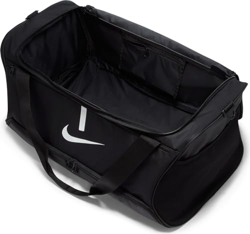 Die Nike Academy Team Sporttasche hat ein strapazierfähiges Design und bietet übersichtlichen Stauraum. Die speziellen Fächer eignen sich zur Aufbewahrung von einem Ball, Schuhen und Kleidung. Dank der Riemen kannst du deine Sachen unterwegs bequem transportieren. Das große Hauptfach bietet Platz für einen Ball und weitere Gegenstände. In dem Reißverschlussfach an der Unterseite kannst du nasse und trockene Sachen getrennt voneinander aufbewahren. Mit den Hand- und Schulterträgern kannst du deine Ausrüstung bequem transportieren. Die kleine Innentasche und die Außentasche mit Reißverschluss eignen sich zur Aufbewahrung kleiner Wertsachen. • Ca. 71 x 35,5 x 35,5 cm (L x B x H) • 95 l • 100 % Polyester • Nur Fleckenentfernung möglich • Importiert