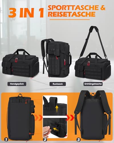 3-IN-1 Sporttasche: Dank ihres vielseitigen Designs kann diese sporttasche als Rucksack oder Handgepäcktasche (außer bei Ryanair) getragen werden und bietet so ultimativen Komfort und Flexibilität, die auch in jeder Umgebung gut aussehen. Egal, ob Sie lieber einen Rucksack oder eine Umhängetasche tragen, diese Tasche bietet Ihnen beide Optionen. Es handelt sich um eine außergewöhnliche Sporttasche, die den vielfältigen Anforderungen von Sport und Reisen gerecht wird.